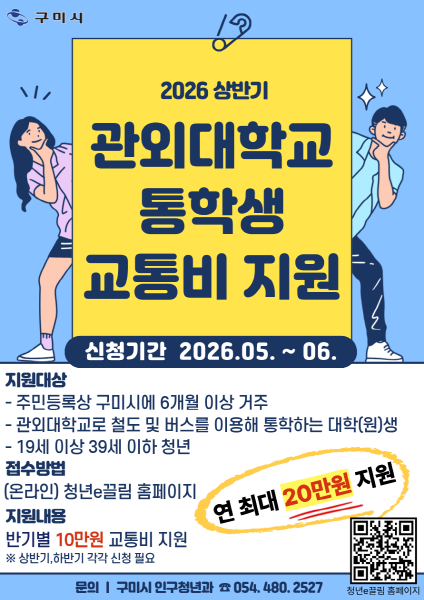 지원 대상은 구미시에 6개월 이상 거주하는 19세부터 39세까지의 관외로 통학하는 대학()생이다. 상반기 신청은 5월부터 6월까지 진행되며, ‘청년e끌림홈페이지를 통해 온라인으로 접수할 수 있다. 지원금은 연간 최대 20만원으로, ·하반기 각 10만원씩 카드형 구미사랑상품권으로 지급된다.