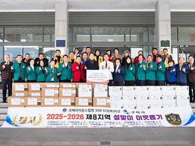 구미시는 지난 10일 시청에서 국제라이온스협회 356-E(경북)지구 제8지역(구미) 라이온스클럽으로부터 전기밥솥 32대와 전자레인지 32대, 총 64대(1,400만 원 상당)를 전달받았다고 밝혔다. 전달식에는 경북지구 조석현 총재와 제8지역 김병재 위원장, 12개 라이온스클럽 회장단이 참석했다. 이번에 기탁된 가전제품은 관내 저소득 취약세대와 사회복지시설에…