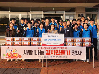 국립구미전자공업고등학교(교장 정성창) 동구미인터랙트 봉사동아리는 26일 진미동 행정복지센터에 직접 담근 김장김치 20상자(130만원 상당)를 전달했다. 정성창 교장은 “학생들의 꾸준한 봉사활동이 지역사회에 따뜻한 힘이 되고 있다”고 했다. 이미경 진미동장은 “전달된 김치는 도움이 필요한 주민들에게 잘 전달하겠다”고 전했다.
