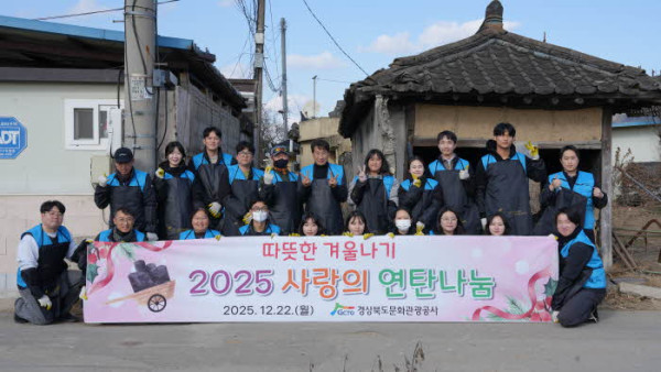 경상북도문화관광공사(사장 김남일, 이하 공사)는 연말을 맞아 지역사회와 온정을 나누기 위한 사회공헌 활동의 일환으로 ‘사랑의 연탄나눔’과 ‘따뜻한 한끼나눔’을 실시했다.