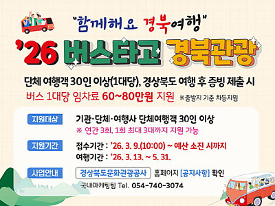 공사 김남일 사장은 “관광지 방문과 지역 소비로 이어지는 단체여행이 늘어날수록 지역에 실질적인 도움이 된다”며 “이번 지원사업을 계기로 경북의 다양한 축제장과 전통시장 등 경북의 현장 콘텐츠를 더 많은 분들이 찾길 기대한다”고 말했다.