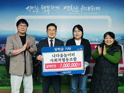영천시는 16일 나다움놀이터 사회적협동조합이 영천시장학회에 장학금 100만원을 기탁하며 지역 인재 육성을 위한 나눔에 동참했다고 밝혔다. 나다움놀이터 사회적협동조합은 아동·청소년·청년·시니어 등 다양한 세대가 함께 어우러지는 지역 공동체 조성을 목표로 설립된 사회적경제 조직이다. 지역 주민들이 조합원이 되어 교육·돌봄·문화·생활 공동체 분야를 중심으로 공익…