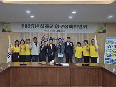 칠곡군은 지난 26일 군청 공감마루에서 ‘2025년 칠곡군 인구정책위원회’를 개최했다. 위원회는 부군수를 위원장으로 군의원, 인구정책 전문가, 여성단체 대표, 관계기관·단체장 및 부서장 등 14명으로 구성되었으며, 인구정책의 실효성을 높이고 지역 여건에 맞는 전략을 논의하기 위해 마련됐다. 이날 회의에서는 「2025년 칠곡군 인구정책 시행계획(안)」을 심의…