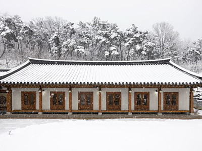 지난 24일 칠곡군에 봄철 눈이 내리면서 향사아트센터 일대가 저녁까지 하얗게 덮였다. 이날 고지대인 한티재에는 최대 13cm의 적설이 기록됐다. 이날 오전부터 내리기 시작한 눈은 오후와 저녁까지 이어졌다. 전통 한옥 양식의 기와지붕과 마당, 주변 수목 위로 눈이 쌓이며 평소와 다른 모습이 연출됐다. 검은 기와 위에 쌓인 눈은 건물의 곡선을 더욱 또렷하게 드…