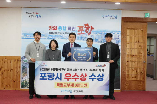 포항시는 지난 22일 행정안전부가 주관한 ‘2025년 지방자치단체 공유재산 총조사 평가’에서 우수지자체로 선정돼 우수상을 수상하고, 인센티브로 특별교부세 3천만 원을 확보했다고 밝혔다.