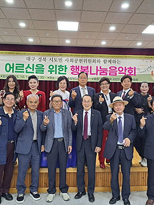 대구경북시도민사회공헌위원회(위원장 조동희, 이하 공헌위원회)20251014() 12 : 30부터 15 : 00까지 구미노인종합복지관 3층 대강당에서 구미시노인지회(지회장 이재호) 부설 구미노인대학(학장 이순락) 수업시간을 이용, 노인대생 200여명을 대상으로 유명가수, 팝페라 성악가수, 전통춤 공연팀 등으로 구성된 봉사원들의 격조높고 감동을 더하는 행복나눔음악회를 개최, 공연 시간 내내 박수갈채를 받으며 열띤 공연을 하였다.
