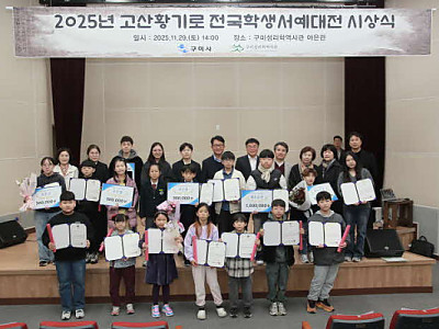 구미시는 29일 구미성리학역사관 야은관에서 ‘2025년 고산황기로전국학생서예대전’ 시상식을 열었다. 이번 대전은 구미성리학역사관이 주최했으며, 지난 8월 추진위원회 개최 뒤 9월 작품 접수와 심사를 거쳐 수상작을 확정했다. 올해 대전에는 총 1,170점이 접수됐으며, 이 가운데 48명의 학생이 수상의 영예를 안았다. 대상(경상북도지사상)은 영예는 성균관대 …