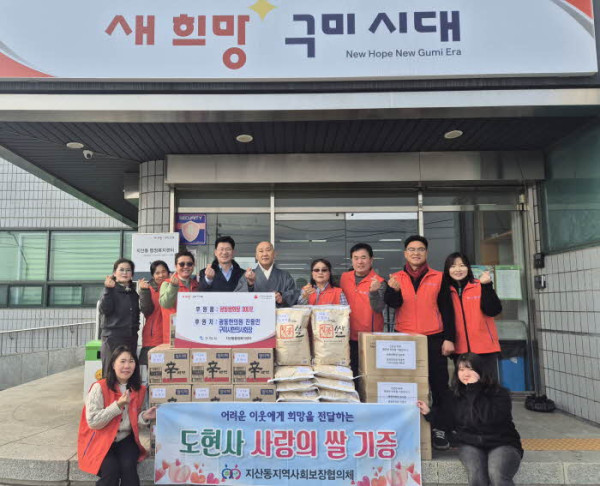 지산동은 12월 29일 지산동행정복지센터에서 도현사(주지 현공스님)와 구미시한의사회(회장 진용인)가 마련한 후원물품 전달식을 가졌다. 도현사는 햅쌀 10kg 20포와 라면 10박스(108만 원 상당)를 기탁했으며, 물품은 독거노인과 취약계층에게 전달될 예정이다.