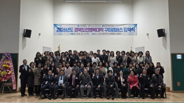 구미시는 19일 국립금오공과대학교 평생교육원 실내체육관에서 신입생 55명과 총동창회 회원 등 70여 명이 참석한 가운데 ‘2026년 제6기 도민행복대학 구미캠퍼스 명예학사과정 입학식을 개최했다.