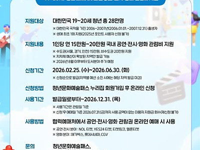 영천시는 25일부터 ‘청년문화예술패스’ 발급 신청을 시작한다고 밝혔다. 청년문화예술패스는 청년들에게 문화예술 관람비를 지원해 문화향유 기회를 제공하고, 적극적 문화소비 주체로 성장할 수 있도록 지원하는 제도이다. 발급 대상은 19~20세(2006~2007년생) 청년이며, 영천시의 경우 선착순 381명이 대상이다. 1인당 연 20만원을 포인트로 지급한다. 지…