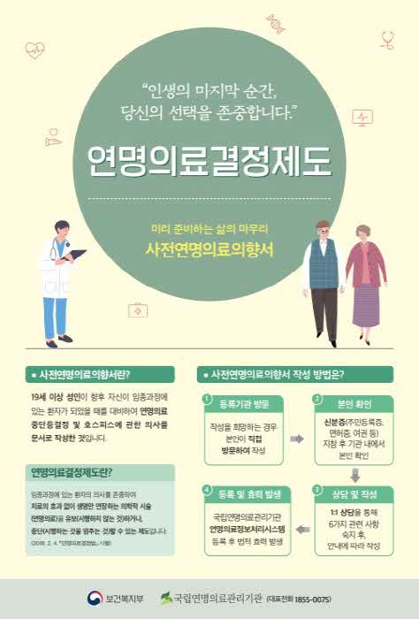 사전연명의료의향서는 임종 과정에 있는 환자가 연명의료 시행 여부와 호스피스 이용 등에 대해 본인의 의사를 사전에 문서로 남기는 제도로, 19세 이상 성인이면 누구나 신분증을 지참해 등록기관을 직접 방문하여 작성할 수 있다.