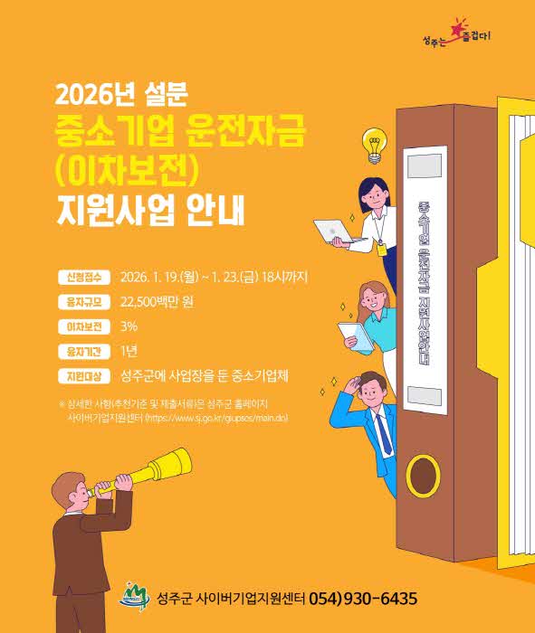 성주군은 설 명절을 앞두고 관내 중소기업의 자금 부담 완화를 위해 2026년도 중소기업 운전자금(이차보전) 설 명절분을 225억원 규모로 지원한다.