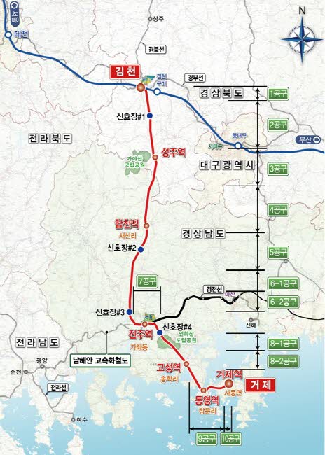 남부내륙철도는 전체 14개 공구로 나뉘어 추진되고 있으며, 이 중 성주군이 포함된 2‧3공구에 대해 각각 롯데건설㈜과 HDC현대산업개발㈜과의 공사 계약이 체결되는 등 사업 추진 절차가 순차적으로 진행되고 있다.