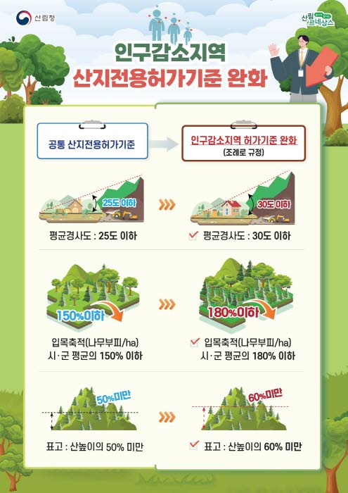 세부 내용으로는 평균경사도 기준은 기존 25도 이하에서 인구감소지역은 30도 이하로 일반지역은 27.5도 이하로 완화되었으며, 헥타르당 입목축적 기준은 해당 시군 입목축적의 150% 이하에서 인구감소지역은 180% 이하로 일반지역은 165% 이하로 완화되었다. 또한, 표고(산자락 하단부를 기준으로 한 산정부의 높이) 기준은 기존 50% 미만에서 인구감소지역은 60% 미만으로 일반지역은 55% 미만으로 완화되었다.