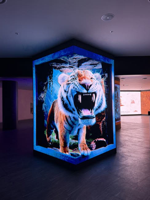 전시관 입구에 들어서면 가장 먼저 일연스님의 따뜻한 환영 인사가 관람객을 맞이하며 역사 속으로의 여행을 안내한다. 이어 거대한 LED 스크린에서는 화면 밖으로 튀어나올 듯한 ‘3D 아나모픽 곰과 호랑이영상이 펼쳐진다. 삼국유사 속 건국 신화의 주인공인 곰과 호랑이가 생생한 움직임의 실감형 콘텐츠로 구현되어, 입구에서부터 관람객들에게 압도적인 시각적 경험과 몰입감을 선사한다.